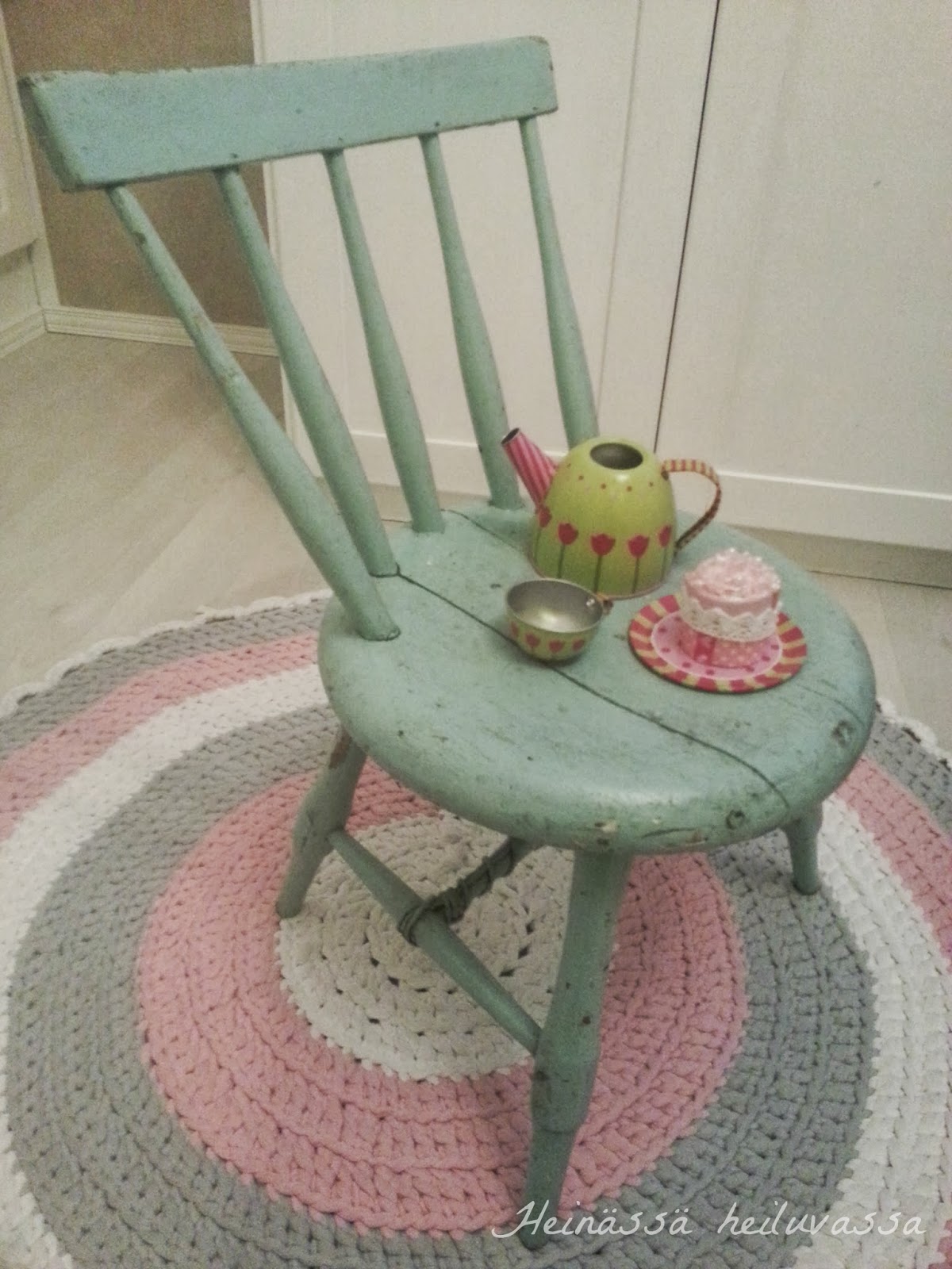 Tämä tuolin vanhus kotiutui meille tuttavan kautta, hylättynä, roskiskuormasta. Lapset tykkäävät tästä hurjasti ja sitä kuljetetaan ympäri taloa. Tuolilla näkyykin eiliset kahvitteluleikit.