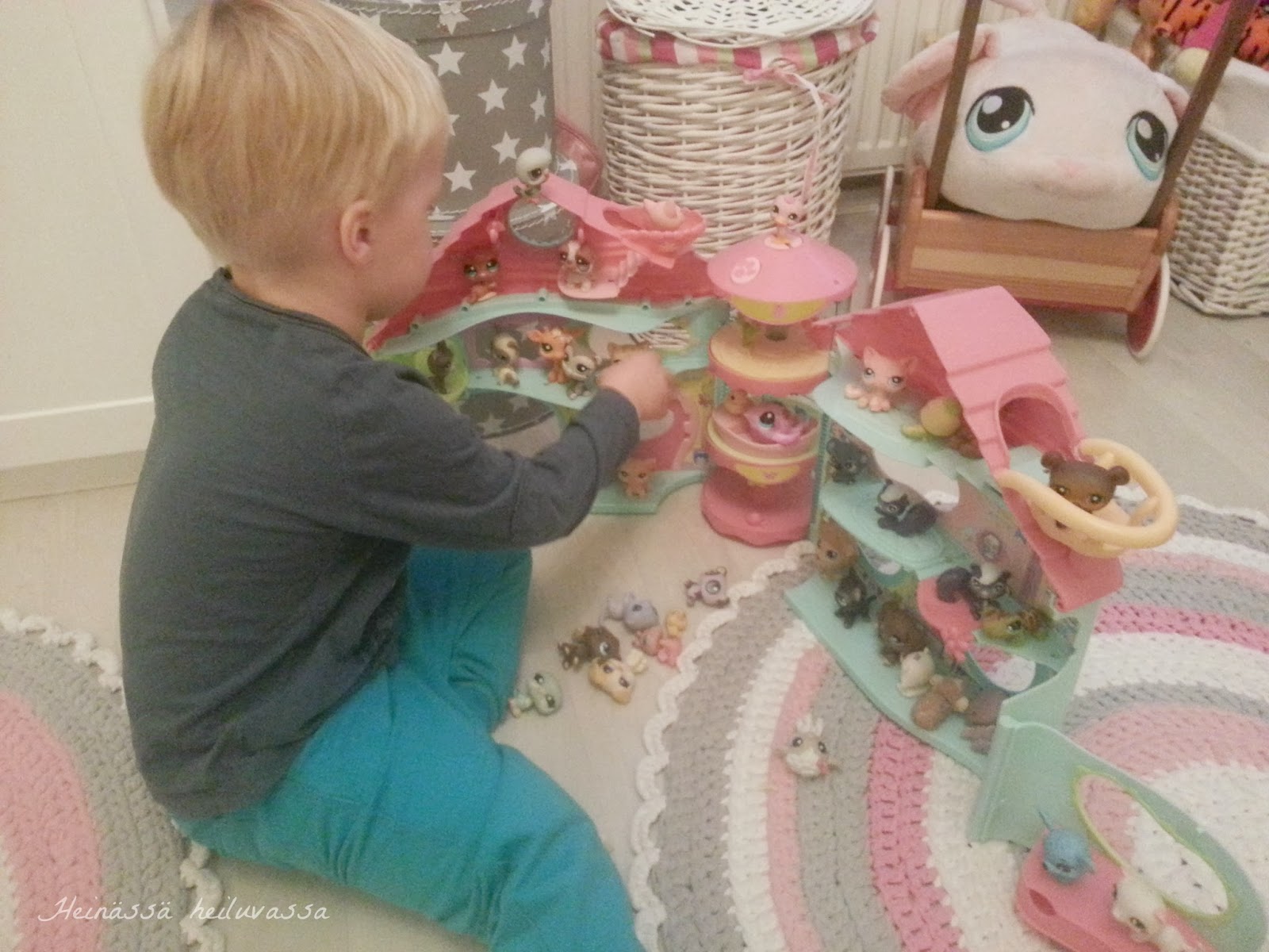 Saatiin naapureilta iso kasa Pet Shopeja ja niiden talo. Heidän neidistä on tullut jo iso, joten ei kuulemma enää tarvinnut näitä. Me ollaan nyt ahkerasti keksitty erilaisia leikkejä näillä ja lapset tykkää. Kiitos vaan naapuriin, tiedän, että luette tämän.