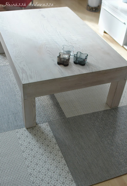 Tämä vanhemmiltani saatu, Ruotsin messujen ostos, olohuoneen pöytä on kyllä iso, mutta niin rakas. Minulle jo ehdotettiin sen vaihtamista, ehei... siinä näkyy elämä. Koira on syönyt pöydän kulmat, lapset hakanneet pöydän pintaa ja poju piirtänyt taideteoksia. Sitä on yritetty puhdistaa ja pitää hyvänä, mutta kyllä se on kaikesta kärsinyt. Silti se on tärkeä!